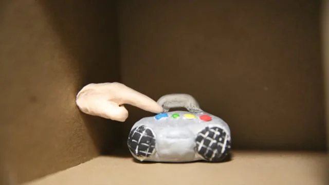 Wooden ball, sandblasted plexiglass, red string, metal rod, wax, found rock, paper clay, spackle, wall paint